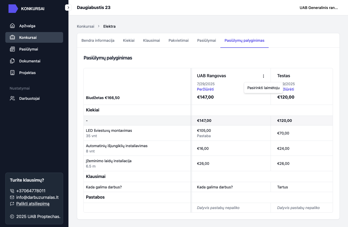 Lengvas būdas surinkti ir palyginti rangovų kainų pasiūlymus – pamirškite ilgus el. laiškų susirašinėjimus, painias Excel lenteles ir neaiškius pasiūlymus. Pristatome sprendimą, leidžiantį sklandžiai valdyti rangovų konkursus nuo pradžios iki pabaigos vienoje patogioje sistemoje.