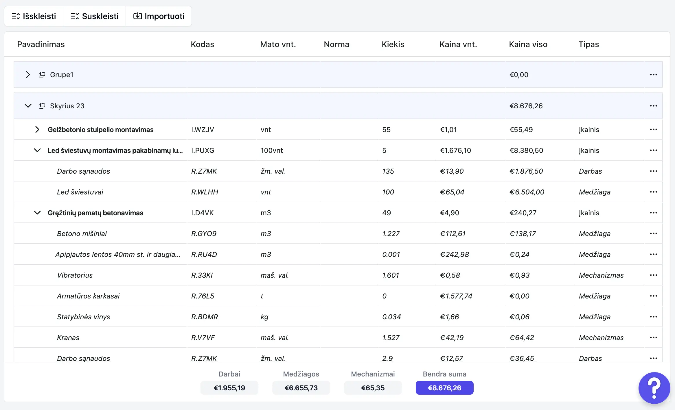 Sąmatoje suplanuoti darbai automatiškai matomi vykdymui.